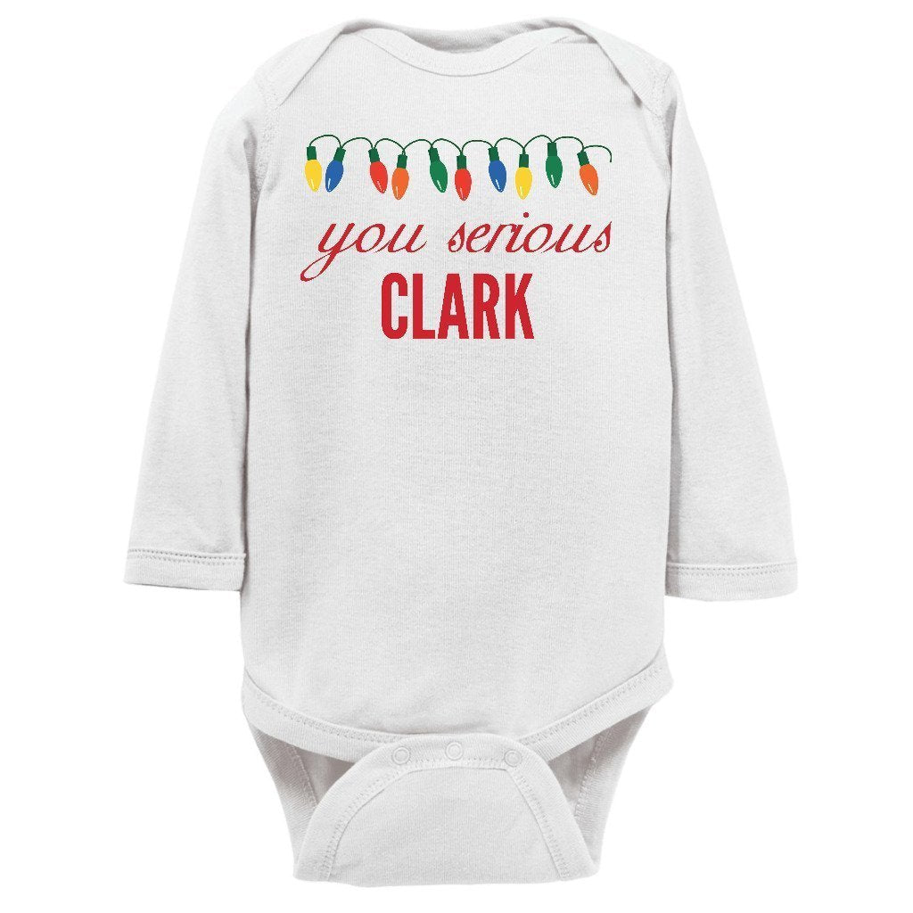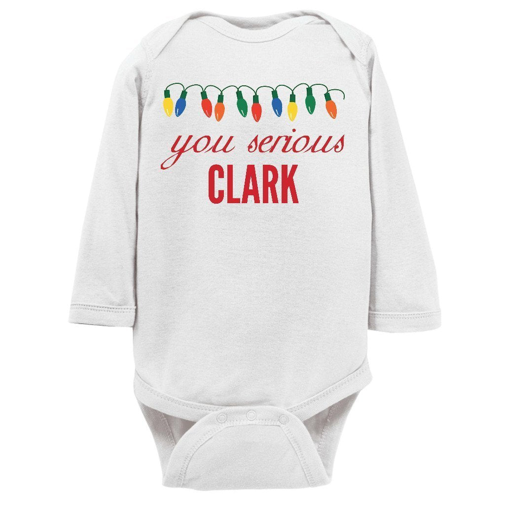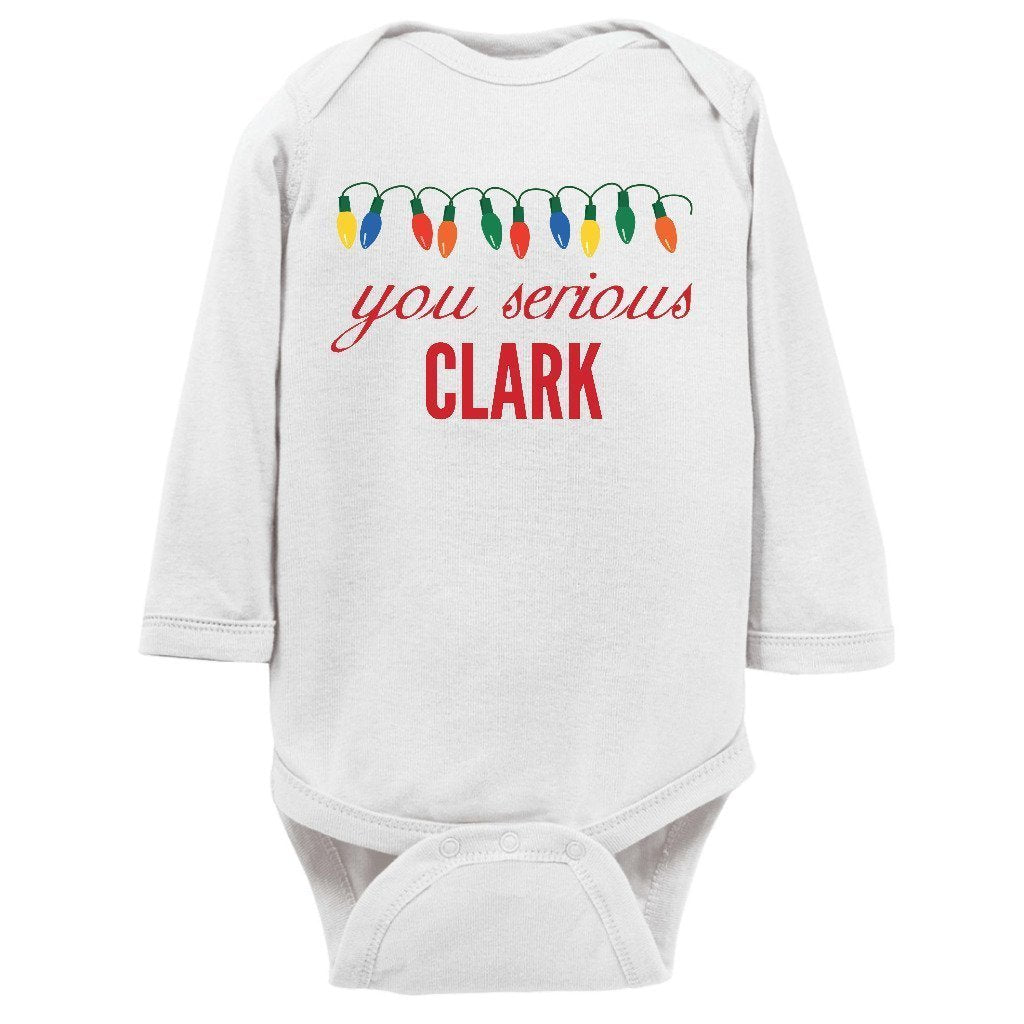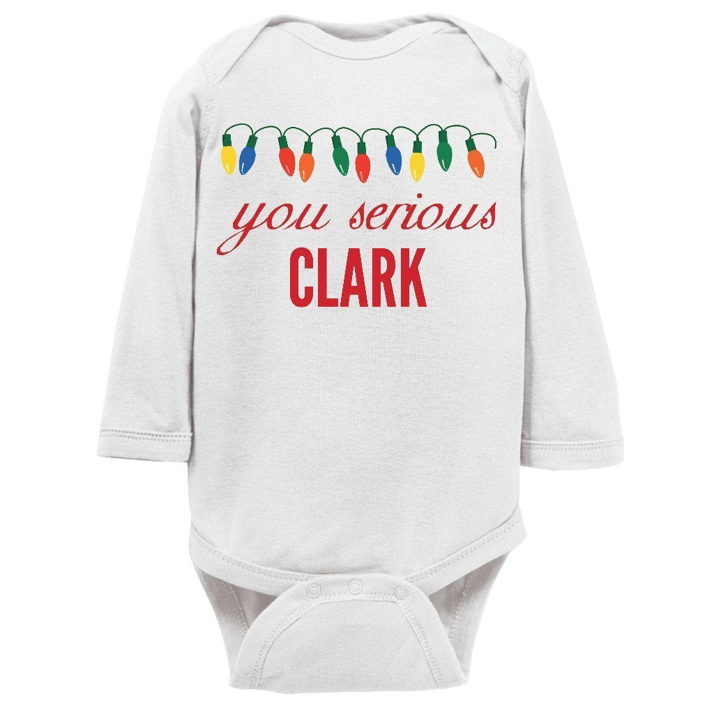 - You Serious Clark Christmas Baby Bodysuit/Onesie or Toddler T-shirt is the perfect funny Christmas outfit for the holiday season. Short or Long sleeve bodysuit / onesie or tee for both infants or toddlers is a great cute and festive xmas clothing to brighten the spirits this December.